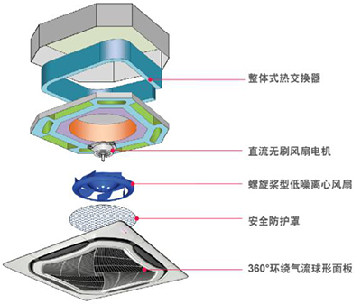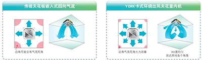 與平面回風(fēng)格柵相比,約克卡式天花室內(nèi)機(jī)(環(huán)形出風(fēng))獨(dú)有的球面回風(fēng)格柵具有更大的回風(fēng)面積,風(fēng)量大噪音低,在回風(fēng)氣流組織方面也更合理;同時(shí)更美觀大方。