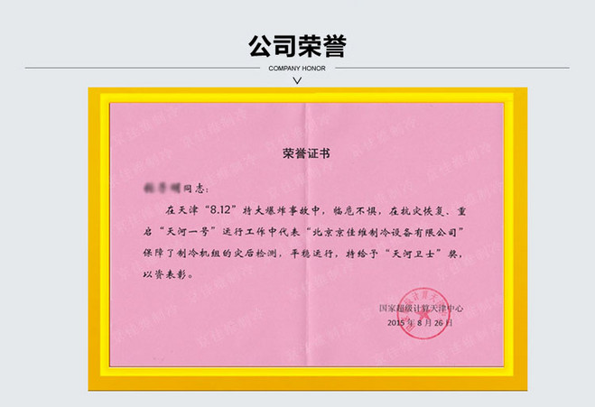 天津港“8·12”瑞海公司危險(xiǎn)品倉(cāng)庫(kù)特別重大火災(zāi)爆炸事故發(fā)生后,引起了天津、全國(guó)乃至世界的強(qiáng)烈關(guān)注,在抗災(zāi)期間,京佳維工作人員參與了重啟“天河一號(hào)”的運(yùn)行工作,我們的工作人員在危難時(shí)刻顯身手,不懼危險(xiǎn),以豐富的工作經(jīng)驗(yàn),精湛的維修技術(shù),堅(jiān)守工作職責(zé),保障了國(guó)家超級(jí)計(jì)算天津中心制冷機(jī)組的災(zāi)后監(jiān)測(cè),使機(jī)組可以恢復(fù)平穩(wěn)運(yùn)行,特給予我京佳維員工“天河衛(wèi)士”的稱號(hào),獲得國(guó)家超級(jí)計(jì)算天津中心的榮譽(yù)證書,我們視這些員工為公司學(xué)習(xí)的榜樣。